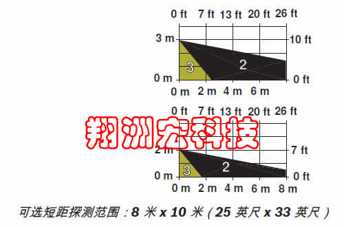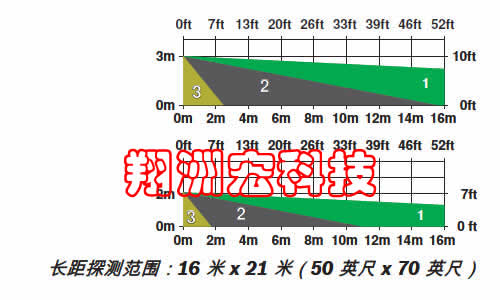 内部光传感器可以测量照射在探测器表面的光照强度。 传感器数据融合技术利用此信息来消除强光源导致的误报。可选探测范围(16 米 x 21 米或 8 米 x 10 米)安装人员可以使用拨码开关选择 16 米 x 21 米或 8 米 x 10 米(50 英尺 x 70 英尺或 25 英尺 x 33 英尺)探测范围。动态温度补偿