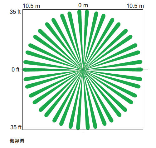 探测器安装高度为 3 米(10 英尺)时,探测范围直径为 15 米(50 英尺)。