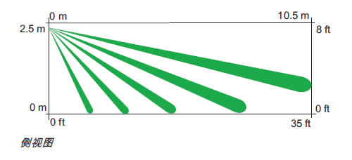 探测器安装高度为 2.4 米(8 英尺)时,探测范围直径为 12 米(40 英尺)。